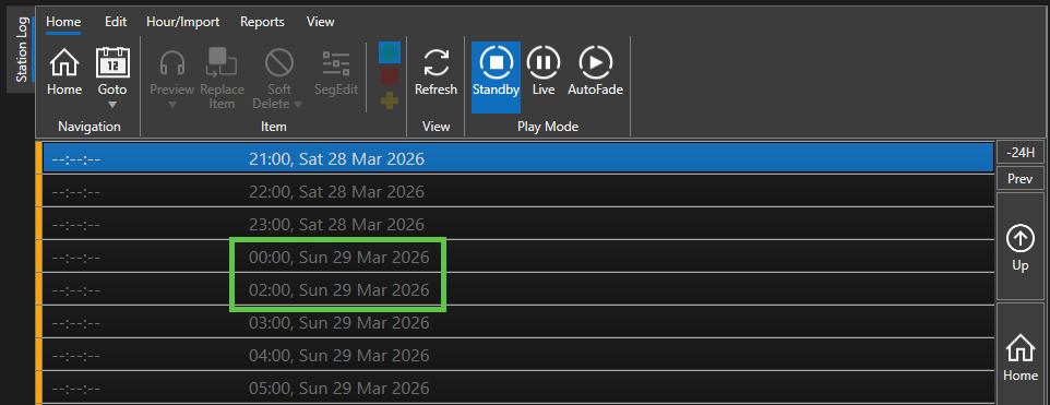 Whether Myriad is set to schedule it's own log OR to import from Log Files, it will simply skip over this hour and no content will be scheduled. You can even run Myriad happily in full AutoFade mode including bringing in any "real-world" audio feeds such as satellite delivered news at the top of hour and they will still happen on time just as you would normally expect.